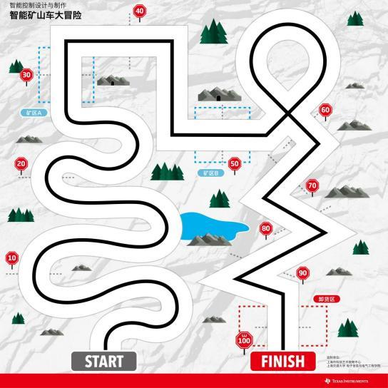 4、 智能矿山车应由预设好的程序自行在赛道内从起点 START处沿黑色轨迹线自动行驶至终点 FINISH 处,并完成运输任务。