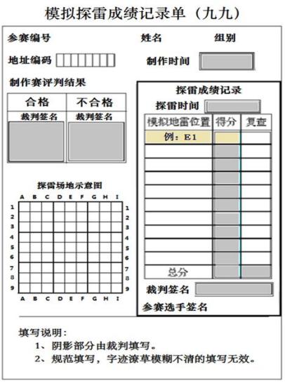 (十四)探雷赛计时方式,以探雷赛结束前参赛队员填写成绩单并交至裁判手中,本轮比赛停止计时。